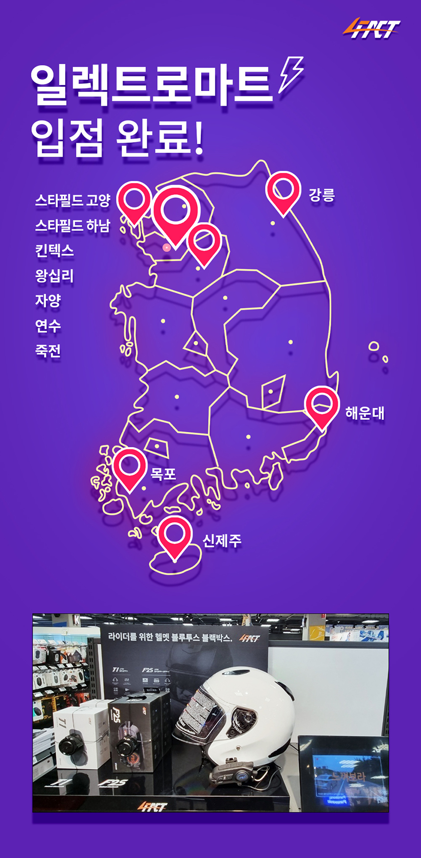 [아시아경제 유현석 기자] 오토바이 헬멧 블루투스 전문 기업 포팩트(4FACT)가 이마트 일렉트로마트의 전국 11개 지점에 자사 제품 ‘T1’과 ‘F2S’ 입점을 완료했다고 13일 밝혔다.