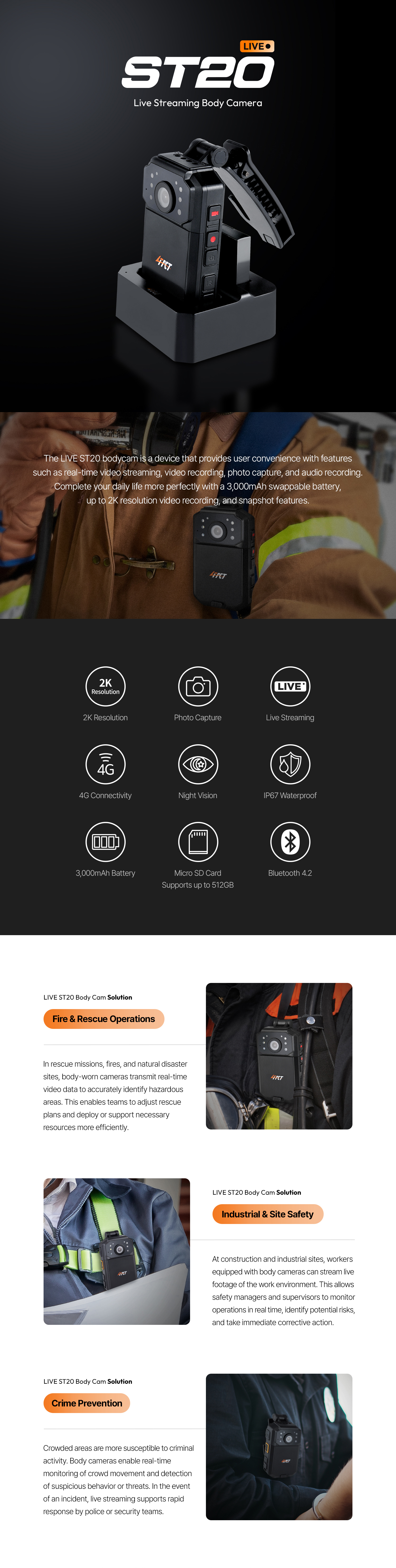 The LIVE ST20 bodycam is a device that provides user convenience with features such as real-time video streaming, video recording, photo capture, and audio recording. Complete your daily life more perfectly with a 3,000mAh swappable battery, up to 2K resolution video recording, and snapshot features.