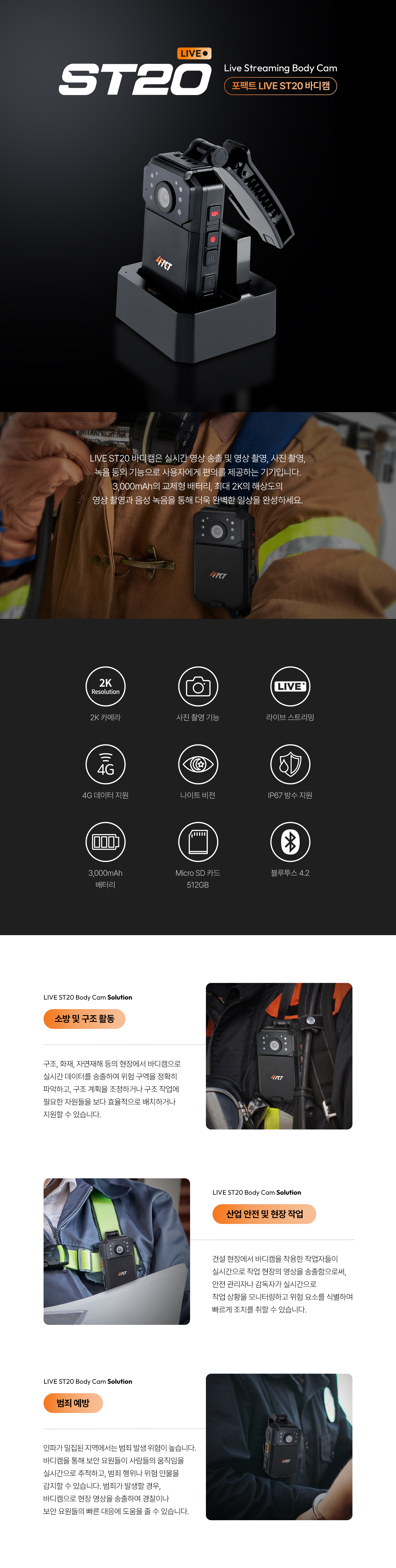 LIVE ST20 바디캠은 실시간 영상 송출 및 영상 촬영, 사진 촬영, 녹음 등의 기능으로 사용자에게 편의를 제공하는 기기입니다.